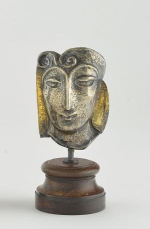 Masque visage de jeune femme, argent, yeux en hématite et socle...