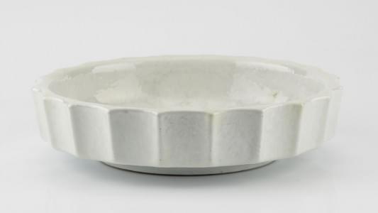 Plat circulaire cannelé, faïence recouverte d'émail blanc, signé...