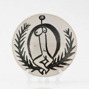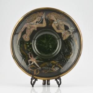 Plat rond à décor de poissons et sirènes, céramique émaillée noi...