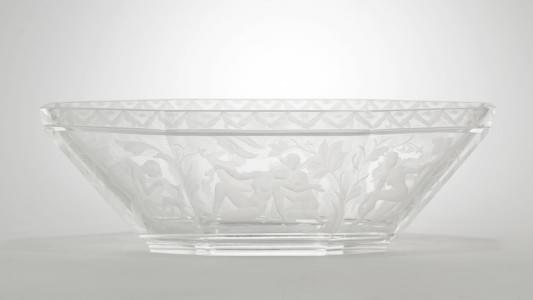 Coupe octogonale, verre translucide à décor gravé d'hommes et de...