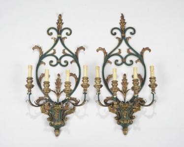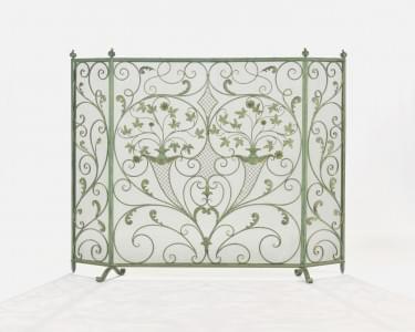 En fer forgé, patiné vert, à 3 pans, à décor de corbeille de fru...