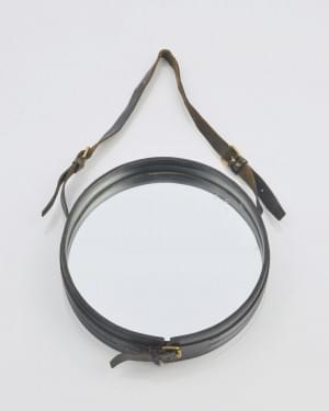 Miroir, cuir noir piqué sellier, laiton doré, D 30 cm