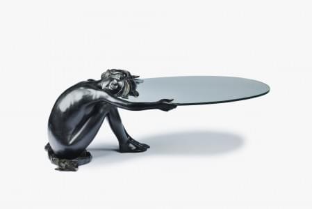 Plateau ovale soutenu par une femme nue, bronze à patine brune,...