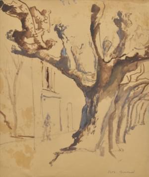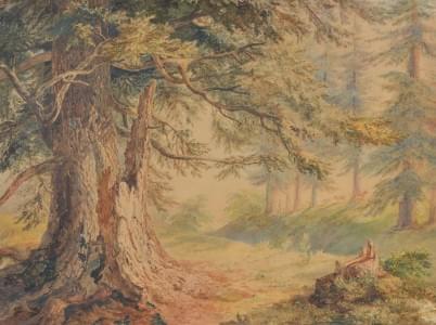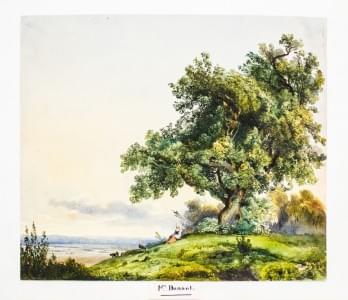 Sous les frondaisons d'un vieux chêne, aquarelle sur papier, sig...