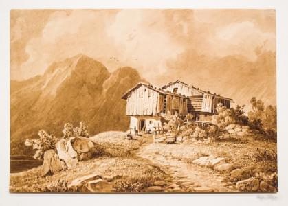Mazots dans un alpage, plume et lavis d'encre sur papier, signée...