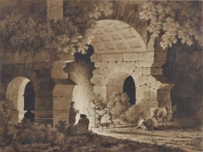 Halte nocturne des paysans près d'un feu, sous une voute antique...