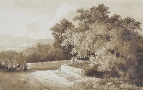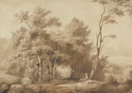 Chemin à l'orée du bois, aquarelle sépia sur papier, signée, 24x...