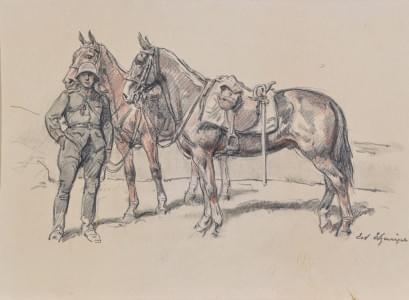 Famille devant l'enclos du cheval, aquarelle sur papier signée,...