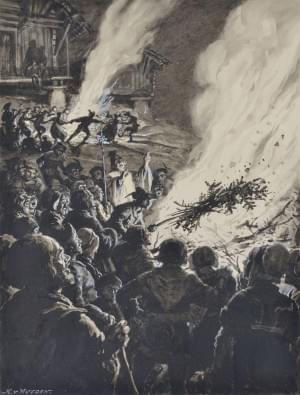 Feux de la Saint Jean en Valais, lavis sur papier signé, 28 x 21...