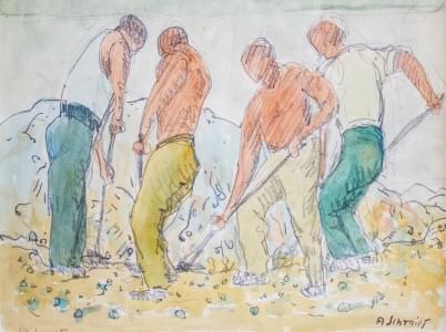 Ouvriers au travail, aquarelle sur papier signée et datée 18 sep...