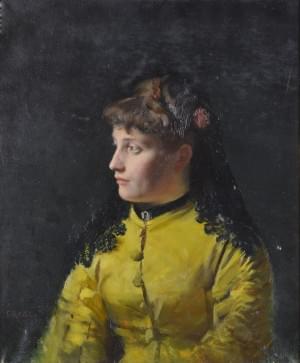 Jeune femme en veste jaune et dentelle noire, huile sur toile si...