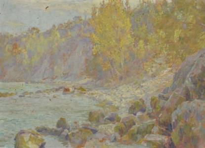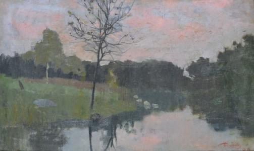 Rivière au crépuscule, huile sur toile monogrammée, 34 x 50 cm