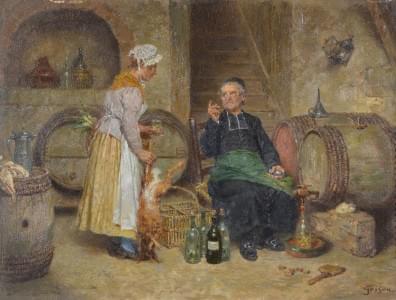 Le curé et sa servante à la cave, huile sur panneau, signée, 15x...