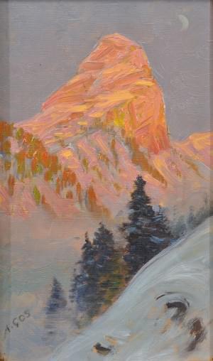 Lever de soleil dans les Mishabel, au-dessus de Saas Fee, huile...
