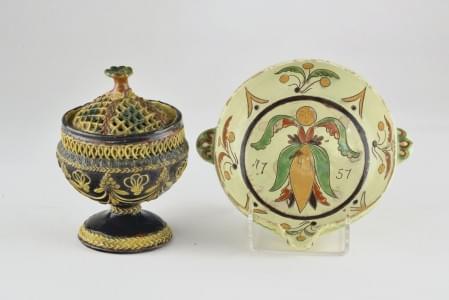 Terre vernissée à décor incisé de fleurs, Thoune XIXe s, H 35 et...