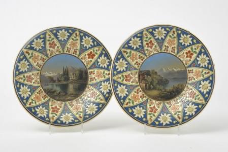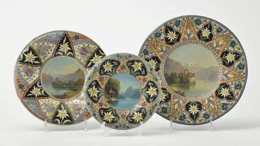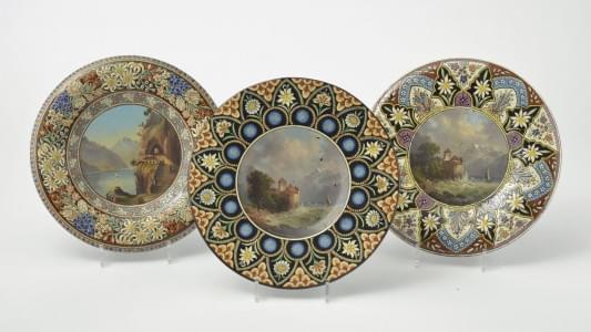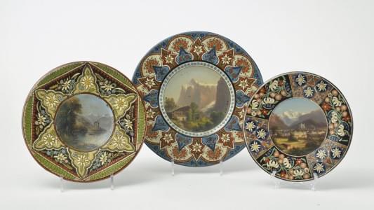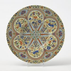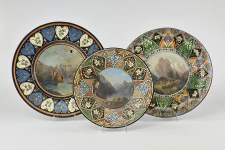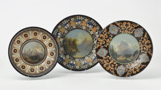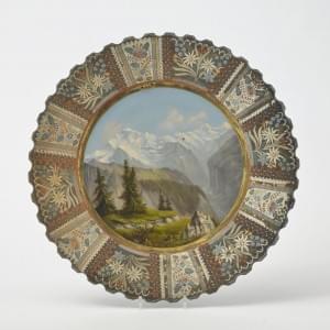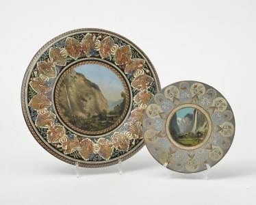 Terre vernissée à décor incisé de fleurs, centre peint de vues d...