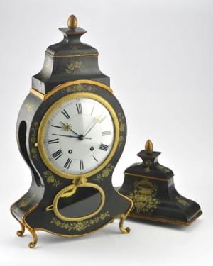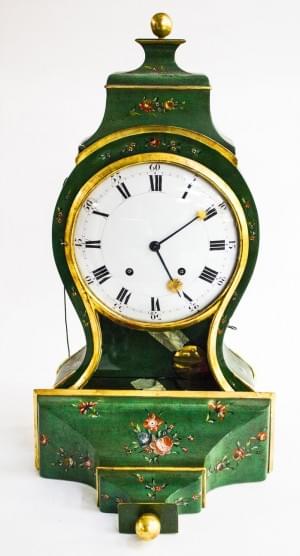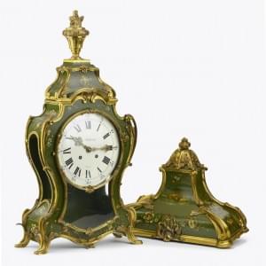 Bois laqué vert à décor de fleurs, bronze doré, cadran émaillé b...