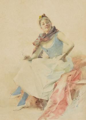 Jeune femme à la cigarette, aquarelle, signée et datée 1889, 37x...