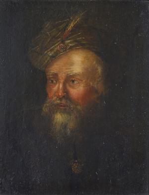 Portrait d’homme âgé à l’oriental, coiffé d’un béret à plume, hu...