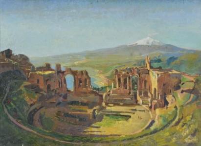 Les ruines du théâtre de Taormine en Sicile, huile sur toile,...