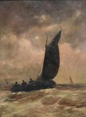 Barque au clair de lune, huile sur toile signée, 33x25 cm