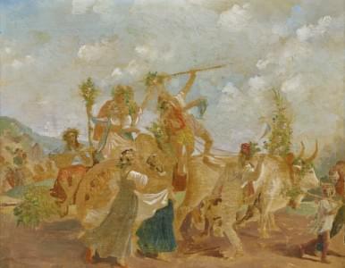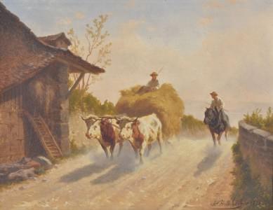 Rentrée du foin, huile sur carton, signée et datée 1871, 21x27 c...