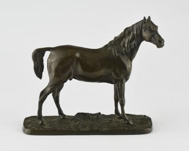 Cheval à l'arrêt, bronze à patine brune, signé sur la terrasse,...