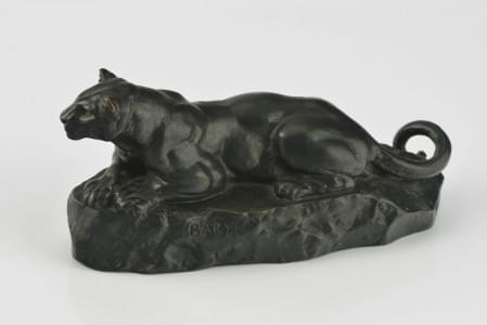 Lionne couchée, bronze à patine foncée, signé, fondeur Barbedien...