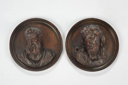 Noyer sculpté, XVIIIème s, représentant les têtes du Christ et d...