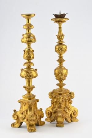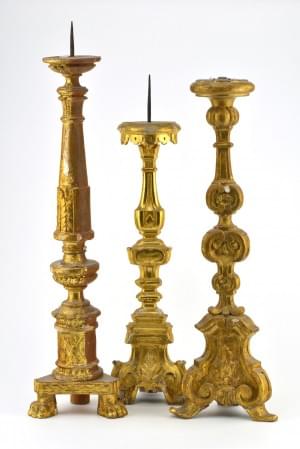 Bois sculpté et doré, l'un pieds griffe, les deux autres en enro...