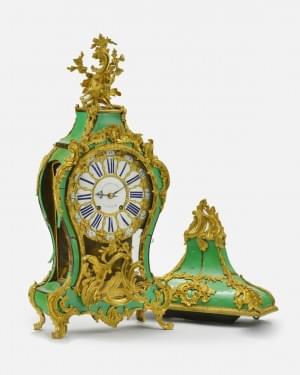 Corne verte et bronze doré à décor de volatiles, coquilles et en...