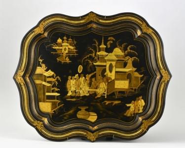 Tôle laquée en noir et or à décor de chinoiseries, 76x63 cm