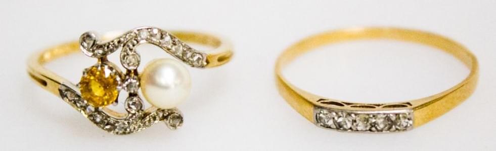 3035. Lot de 2 bagues serties de diamants, d'émeraudes et d'une perle