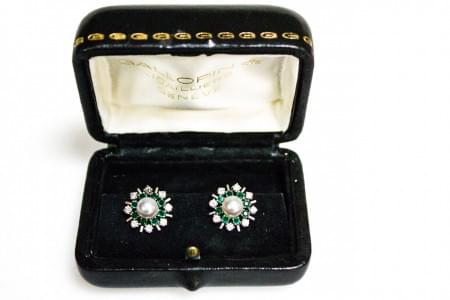 3074. Paire de boucles d'oreilles et bague serties d'émeraudes et de d...