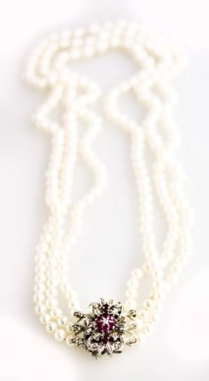 3081. Collier 3 rangs de perles, fermoir serti de rubis et d'un diaman...