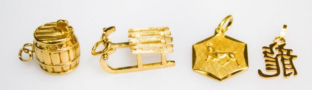 3086. Lot de 4 pendentifs représentant une luge, un tonneau, une médai...