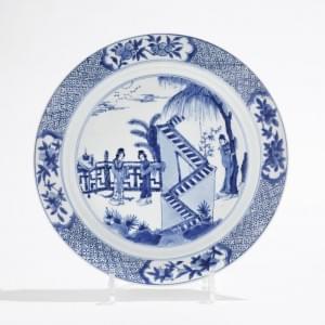 Porcelaine bleu blanc à décor de personnages dans un jardin et m...