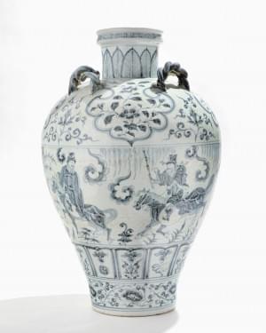 Porcelaine émaillée bleu et blanc à décor de cavaliers, arbres e...