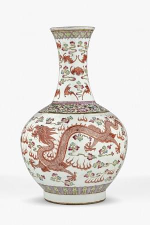 Porcelaine émaillée polychrome à décor de deux dragons poursuiva...