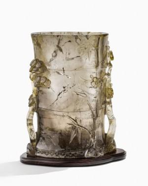 Cristal de roche fumé sculpté à décor des trois amis de l'hiver,...