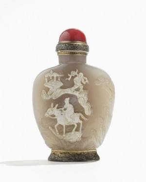 Agate sculptée à décor d'une scène animée, monture en argent et...