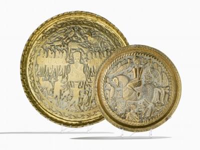 936. Deux plats ronds à décor de cavaliers et personnages, Iran