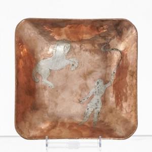 Coupe carrée à décor de dresseuse de cheval, cuivre et étain, po...