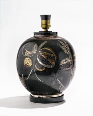 Pied de lampe, céramique émaillée noire, à décor de fleurs et pa...