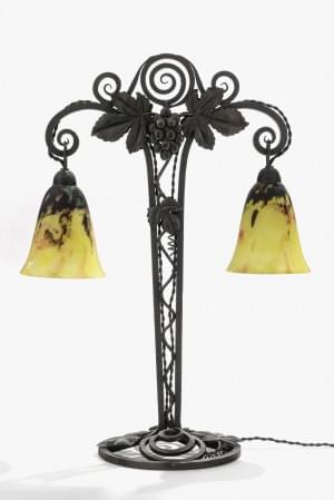 Deux lumières, verre marbré jaune et monture en fer forgé à déco...