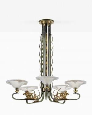 1141. Lustre Art Déco à cinq bras de lumières à décor de chasseresses