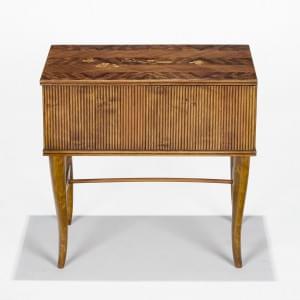 Placage de bois fruitier à décor marqueté de bobines, ciseaux, f...