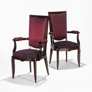 Paire de fauteuils, palissandre et soie bordeaux à motif de fleu...