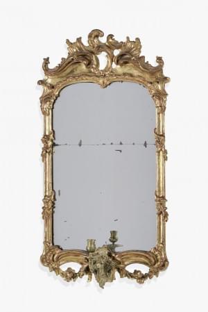 Bois sculpté et doré, glace au mercure, un bras de lumière, 74x3...