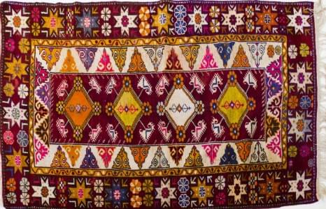 Laine à décor de motifs géométriques sur fond rouge brique, 246x...
